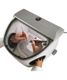 De Eclipse werkcabine is ideaal voor dit soort werk. Met zijn brede gezichtsveld, interne daglichtverlichting en beschermkappen kan de professional schoon en comfortabel werken. Met zijn kleine afmetingen en lichte gewicht kan hij een vaste plaats innemen of een nomadisch element zijn in het laboratorium. eenvoudige aansluiting op een stofzuiger (niet meegeleverd).TECHNISCHE SPECIFICATIES