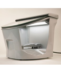 De algemene uitstraling van dit werkstation, met zijn zachte, ronde lijnen, maakt het bijzonder aantrekkelijk. Het past perfect in elke werkplek. Het veiligheidsglas is op precies de juiste afstand geplaatst om te voorkomen dat het geraakt wordt tijdens de verschillende handelingen en zorgt voor een prettig gezichtsveld. Dankzij het lage gewicht en de compacte afmetingen kan hij in een speciale ruimte blijven staan of door het laboratorium worden verplaatst. Kortom, een ontwerp dat esthetiek en functionaliteit combineert, waardoor het dagelijkse prothetische werk een plezier wordt.