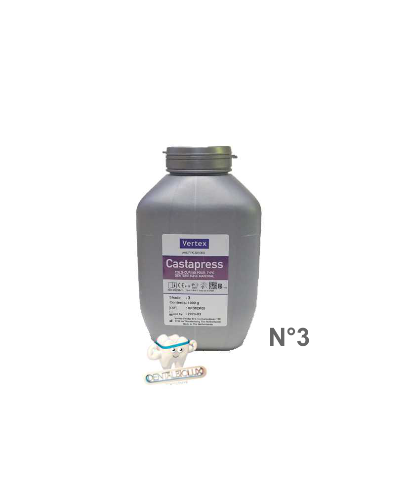 Vertex Castapress is een zelfhardend, gietbaar basismateriaal voor tandprothesen, dat ook geschikt is voor het repareren, ondervullen en uitbreiden van partiële prothesen. Dankzij het unieke versnellingssysteem garandeert het een optimale kleurstabiliteit.