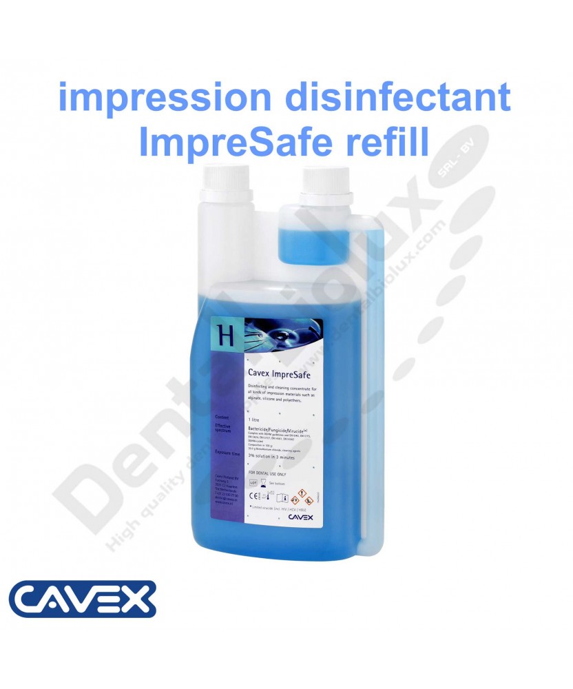 disinfectant for alginate, polyether and silicone impressionsFeaturesonly 3 minutes to kill bacteria, fungi and virusesno negative influence on the impression surfacehighly concentrated thus saving storage spaceone litre of Cavex ImpreSafe equals 33 litres ready-to-use disinfection fluidaldehyde free and has a neutral smellavailable as a complete system for the dental practicecomplies with DGHM guidelines and EN 1040, EN 1275, EN 13727, EN 13624, EN 14561 and EN 14562