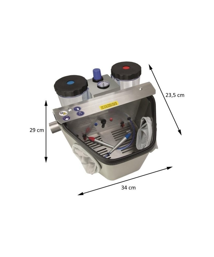 De opkomst van nieuwe, steeds grotere en geavanceerdere technologieën neemt ruimte in beslag in zowel het laboratorium als de tandartspraktijk. De pluton zandstraler is ontworpen als oplossing: door zijn kleine afmetingen is er gemakkelijk een plaats voor te vinden. De ruimte in de kamer maakt het echter mogelijk om comfortabel te schuren en de prestaties zijn volledig vergelijkbaar met die van zijn grotere broers en zussen.