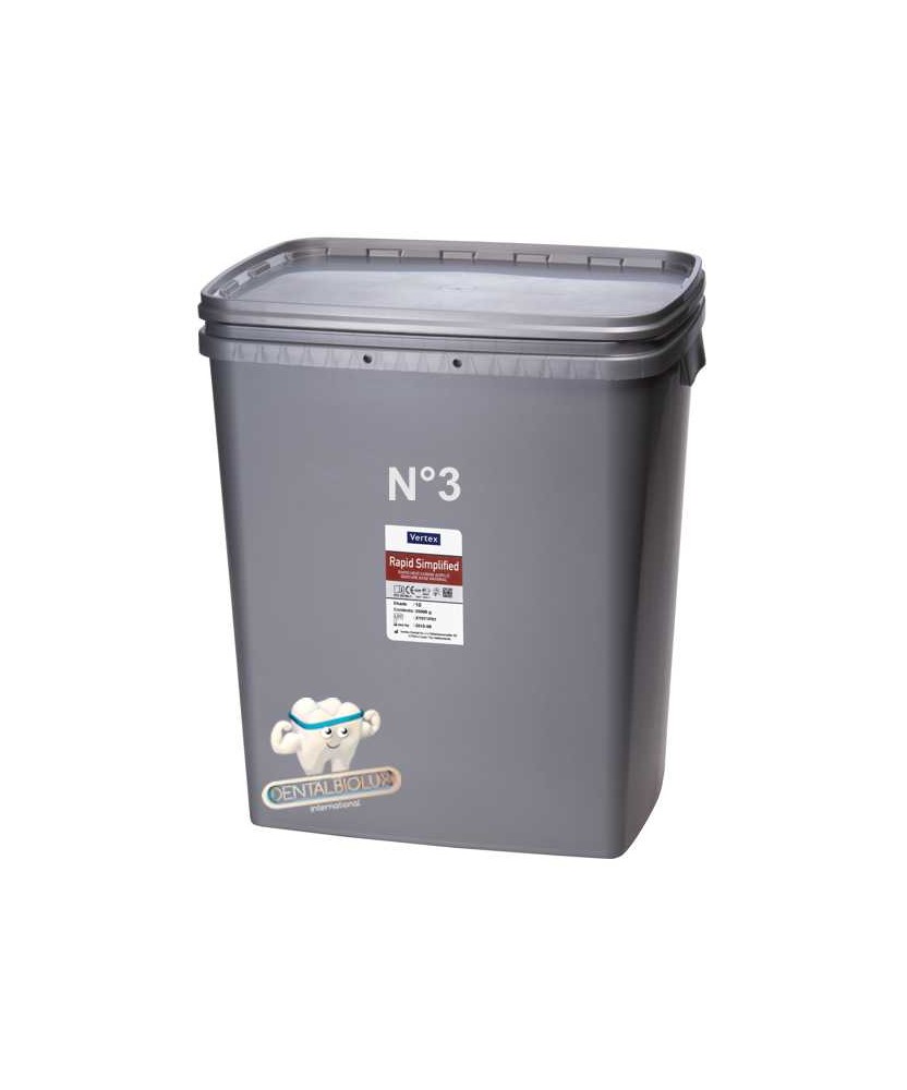 Description:Rapid Simplified is a heat-curing denture base material and forms a solid base for full and partial dentures. The pressing technique is the processing method for Rapid Simplified. This cadmium-free acrylic has a rapid 20 minutes polymerisation cycle (also overnight polymerisation is possible). Flask to be put in boiling water. Authentic pressing technique course is educated at the Vertex™ Dental Academy by using Vertex™ Rapid Simplified.Technical specifications:Dough time15 minutesWorking time30 minutesCuring time20 minutes at 100°CMixing ratio by volume / parts by weight1 ml / 0.95 g liquid (monomer) 2.3 g powder (polymer)Impact-resistance11.3 kJ/m2Flexural strength85.2 MPaFlexural modulus2367 MPaWater sorption22.5 µg/mm3Solubility0.11 µg/mm3Shades:* 1 (pale pink)* 2 (pink opaque)* 3 (translucent pink)* 4 (clear)* 5 (pink, veined)* 6 (dark pink, veined)* 7 (blue-pink, veined)* 8 (blue-pink)* 10 (translucent pink, veined)* 14 (brown-pink, veined)